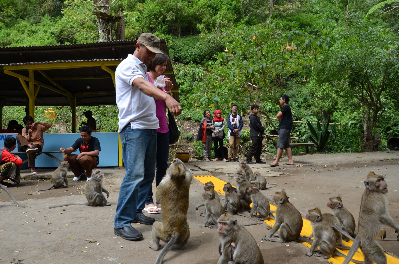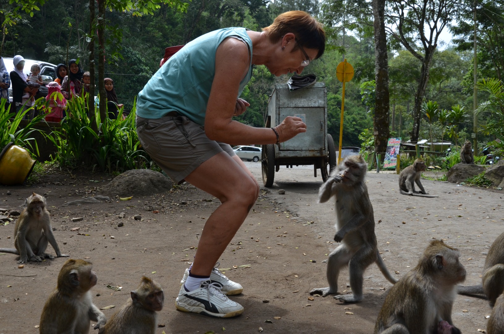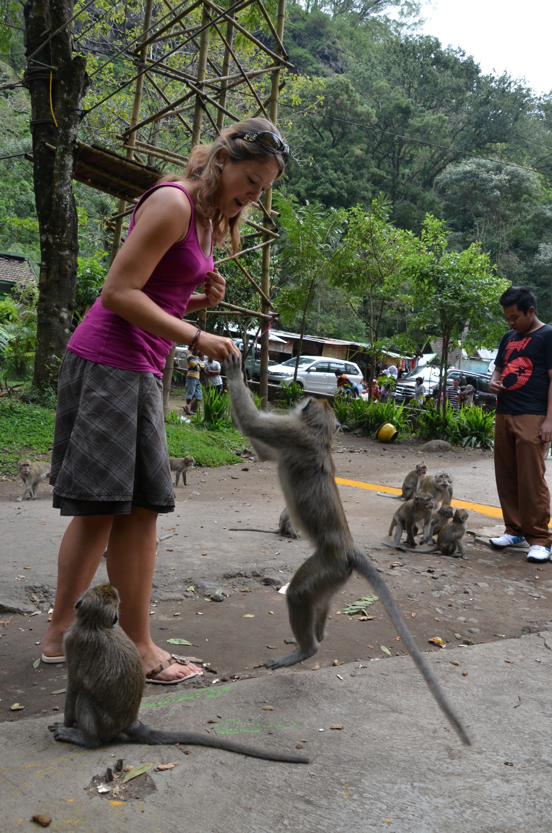 27. – 28. Juli – Nach dä lange Autofahrt nach Malang sind mer am nögste Tag nomel chli zrug zumä schöne Wasserfall. S’Highlight isch aber eher bim Parkplatz gsi, wo ä ganzi Affäbandi uf üs gwartet het. Und zwor Wort-wörtlich. 😉 Diä hend au uuh herzig usgseh und mer hend diä au grad nöcher müässä aluagä. Det hends denn aber eher scho mol chli zähn zeiget und mer hend scho chli Respekt gha. Dä Agus het üs denn aber es Pack Nüssli kauft und mer hend diä däne chöne füättere. Do het denn alles grad chli anderst usgseh und diä hend üs diä ganz liäb zu dä Händ uspickt.