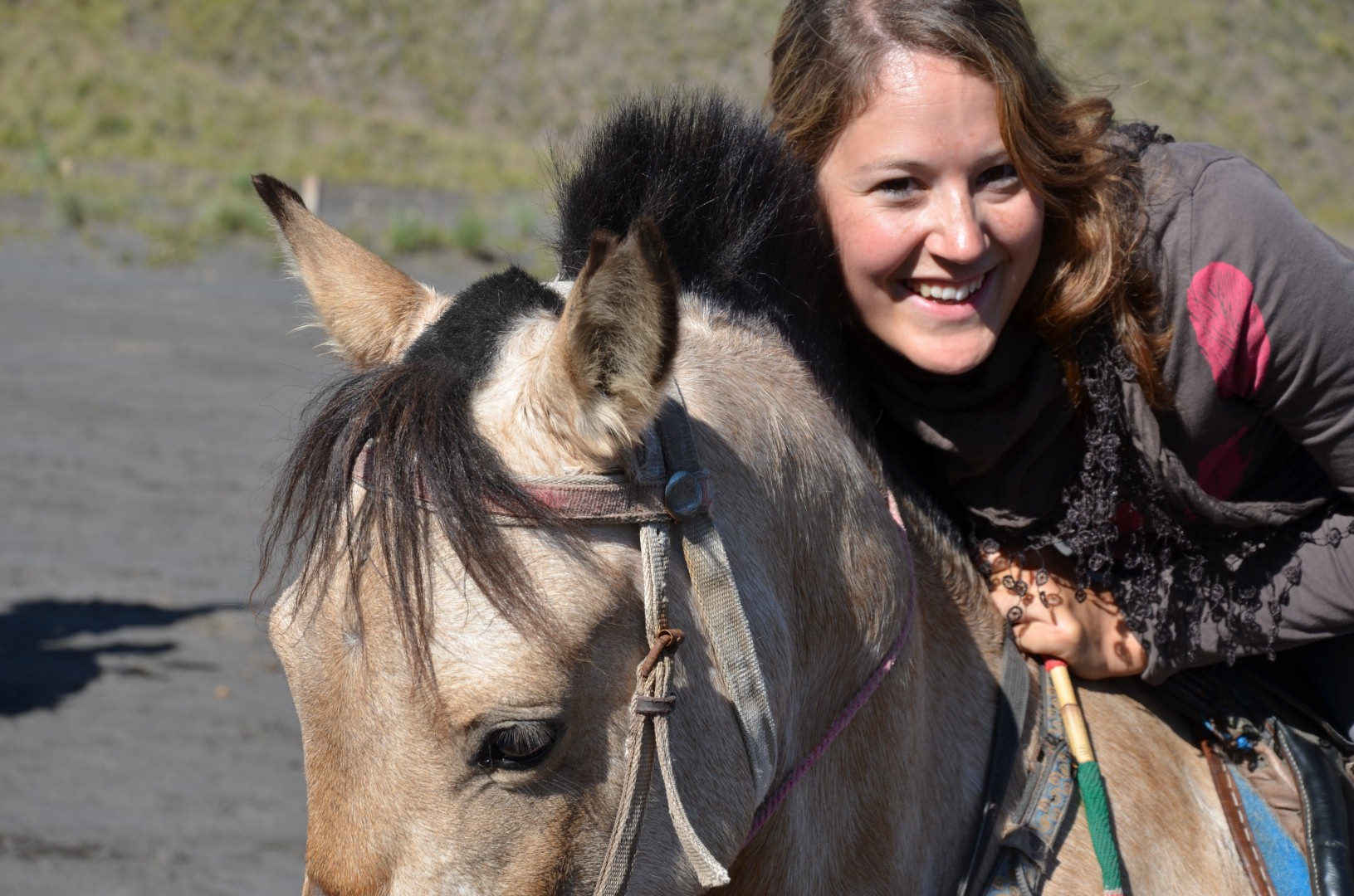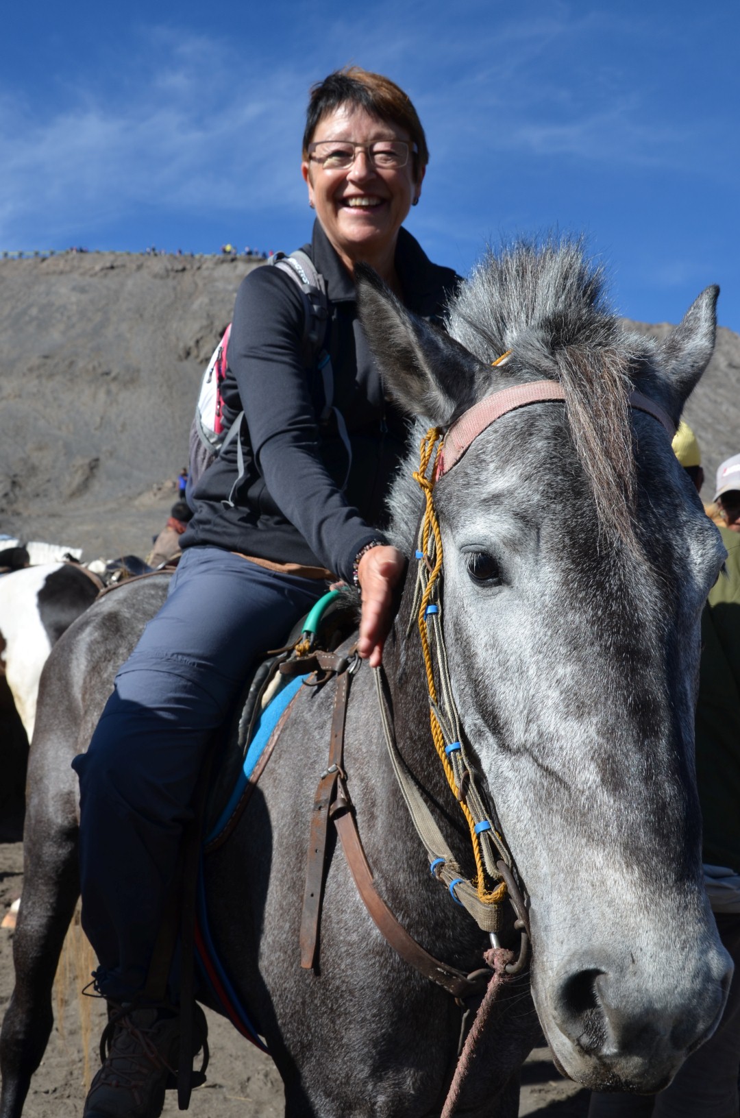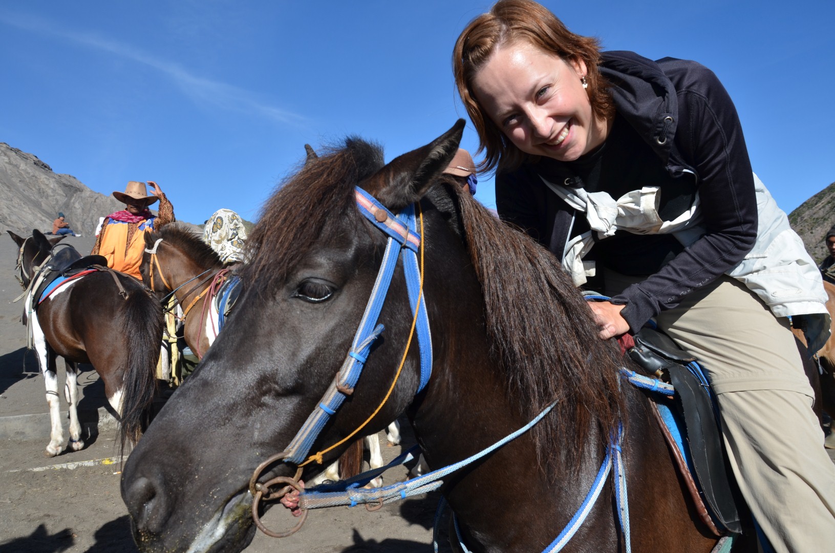Nach em bestuhnä vum Bromo us dä Distanz isch denn au wiiter gange zum ganz zum Krater ufä z’stiege. Dodäzu hend mer aber nomel es rechts Stuck über diä Vulkanlandschaft müässä fahre. Unä acho hend üs ganz viel Ritter mit ihren Ross bedrängt. Mer hend kum zu üsem Jeep chönä usstiege. Isch äbe so gsi, das mer zum Vulkankrater ufä hend chönä ritä. Und do isch nit eifach es Ross für üs bereit gsi sonder mer hend üs vo all däne afach eis chönä ussuachä. Klar het jede wöllä das mer sis nähmet. I han denn no chli länger gha bis ich mich entschiede han. Do isch d’Helen mit ihrem Pony und em Guide schu uf em Weg gsi. Bi mir und dä Dömi hends denn aber schnell gmerkt das mer nit s’ersti mol uf däne Rössli hocket und mer hend grad frei hand übercho. Mer hend mit üsnä Pony chönä über diä Ebeni galoppiere und hend au d’Helen so wieder igholt. En heide Spass für üs. 😉