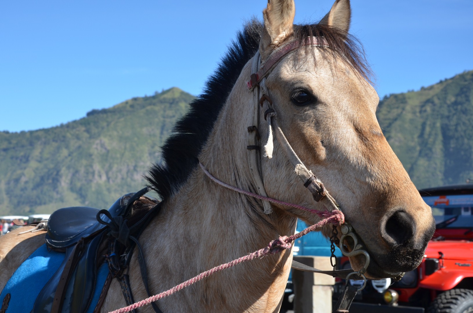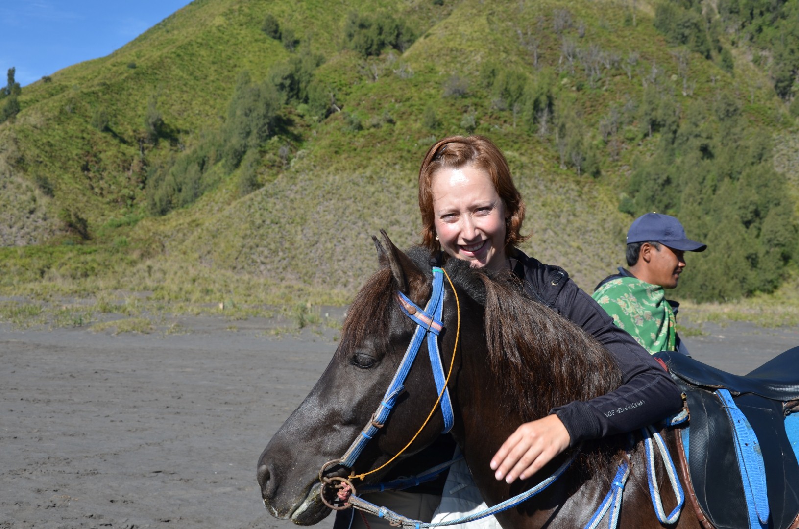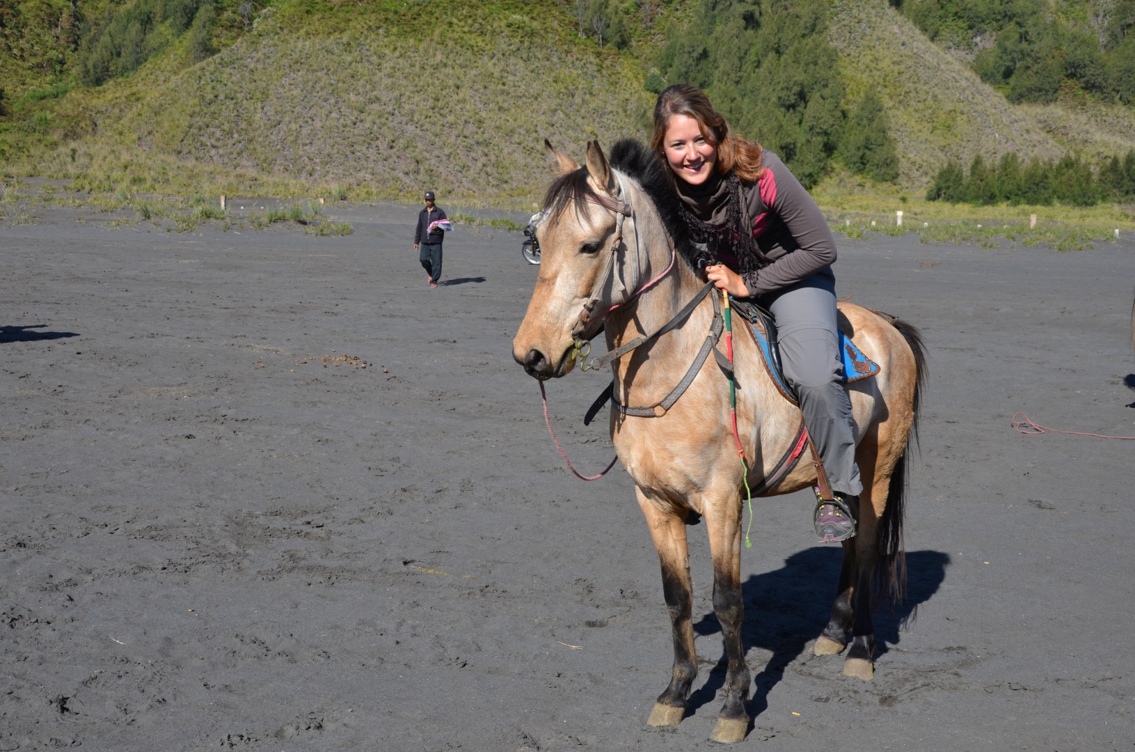 Nach em bestuhnä vum Bromo us dä Distanz isch denn au wiiter gange zum ganz zum Krater ufä z’stiege. Dodäzu hend mer aber nomel es rechts Stuck über diä Vulkanlandschaft müässä fahre. Unä acho hend üs ganz viel Ritter mit ihren Ross bedrängt. Mer hend kum zu üsem Jeep chönä usstiege. Isch äbe so gsi, das mer zum Vulkankrater ufä hend chönä ritä. Und do isch nit eifach es Ross für üs bereit gsi sonder mer hend üs vo all däne afach eis chönä ussuachä. Klar het jede wöllä das mer sis nähmet. I han denn no chli länger gha bis ich mich entschiede han. Do isch d’Helen mit ihrem Pony und em Guide schu uf em Weg gsi. Bi mir und dä Dömi hends denn aber schnell gmerkt das mer nit s’ersti mol uf däne Rössli hocket und mer hend grad frei hand übercho. Mer hend mit üsnä Pony chönä über diä Ebeni galoppiere und hend au d’Helen so wieder igholt. En heide Spass für üs. 😉